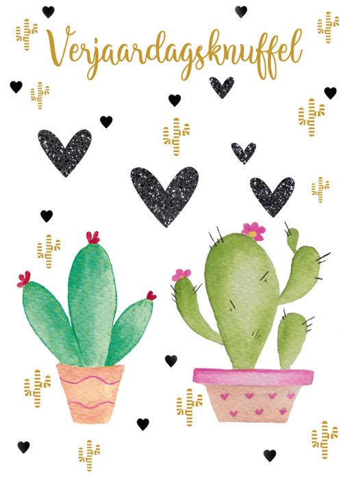 Vrolijke verjaardagskaart om je vrienden of familie eens flink mee te verrassen op hun verjaardag. Op de kaart zie je twee cactussen en de tekst: Verjaardagsknuffel.