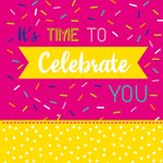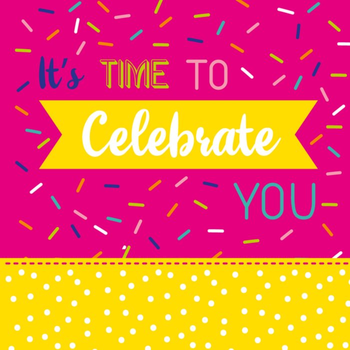 Feliciteer de jarige met deze vrolijke kaart van paperclip. De kaart is aan de voorkant roze. Midden op de kaart staat de tekst "It's time to celebrate you". Om de tekst heen zie je allemaal sprinkles.