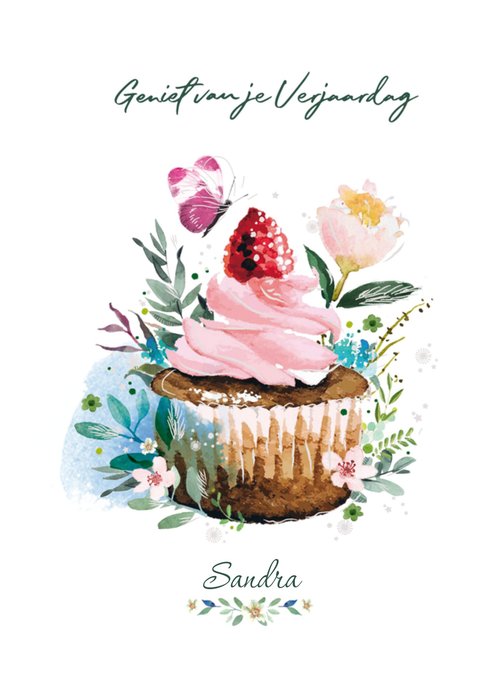 Illustratieve verjaardagskaart met bloemen, een cupcake, aanpasbare naam en de tekst: 'Geniet van je verjaardag'. Verras de jarige met deze mooie verjaardagskaart van Paperclip.
