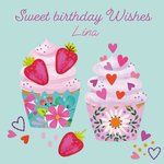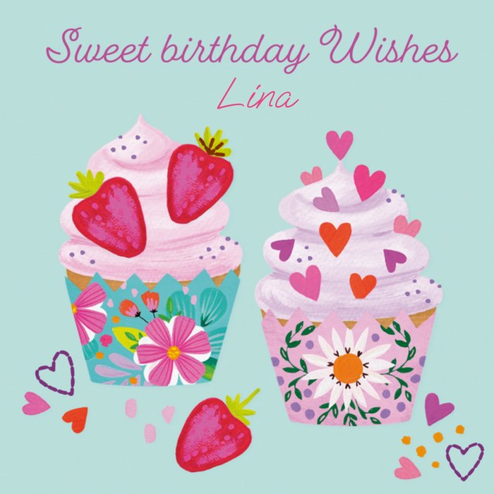 Kleurrijke verjaardagskaart met hartjes, cupcakes en de tekst: 'Sweet birthday wishes'. Verras de jarige met deze leuke verjaardagskaart van Paperclip.