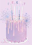 Kleurrijke verjaardagskaart met een taartspektakel, een paarse achtergrond en de tekst: 'Feest'. Verras de jarige met deze illustratieve verjaardagskaart van Paperclip.