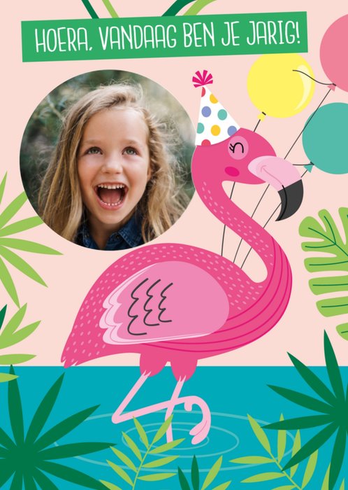 Kleurrijke verjaardagskaart met daarop een flamingo en de tekst: Hoera, vandaag ben je jarig! Je kunt een leuke foto toevoegen op de kaart.