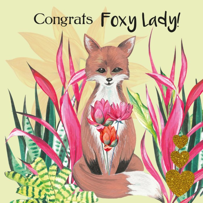 Verjaardagskaart van Paperclip met daarop een vosje die drie bloemen vasthoudt en op de kaart staat de tekst: Congrats foxy lady!