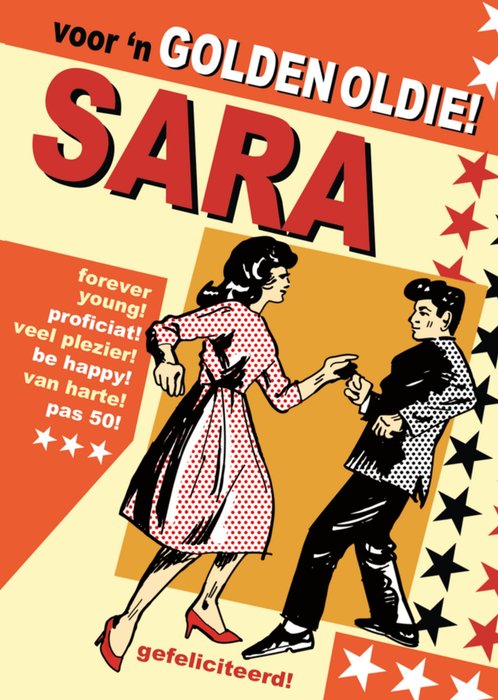 Feliciteer een Sarah met deze gave verjaardagskaart met daarop een dansend stel en de tekst: Voor 'n golden oldie! Forever young! Proficiat! Veel plezier! Be happy! Van harte! Pas 50! Gefeliciteerd!