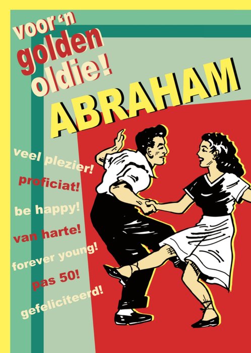 Vrolijke verjaardagskaart om een Abraham een fijne 50ste verjaardag mee te wensen met op de kaart de tekst: Voor 'n golden oldie! Abraham. Veel plezier! Proficiat! Be happy! Van harte! Forever young! Pas 50! Gefeliciteerd!