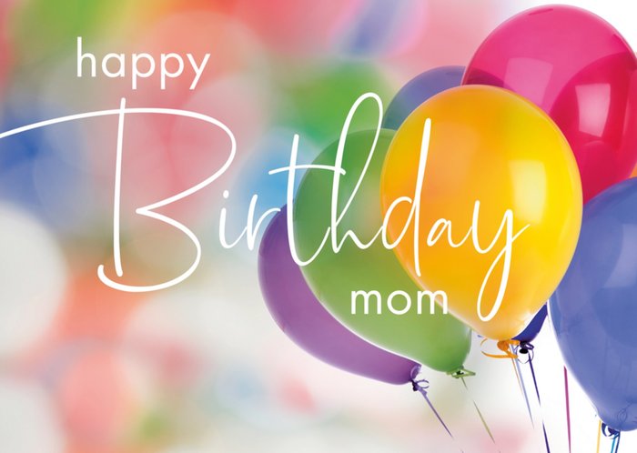 Vrolijke verjaardagskaart om naar je moeder te sturen met ballonen op de kaart en de tekst: Happy birthday mom.