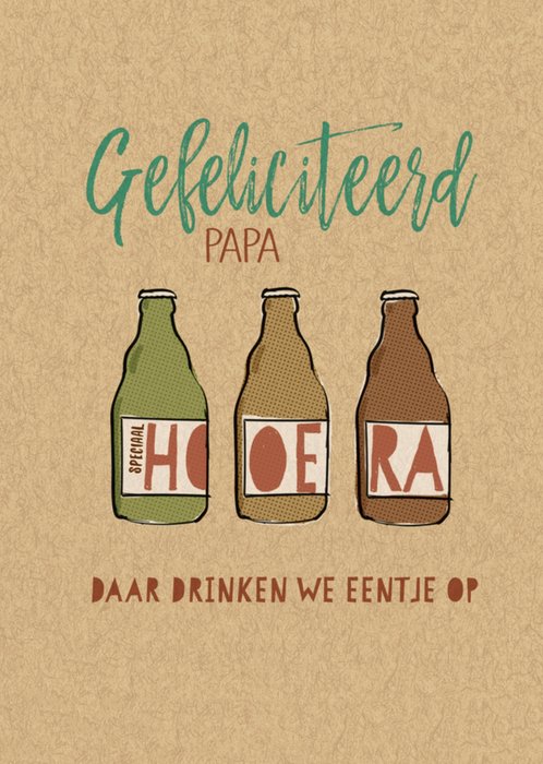 Feliciteer je vader met deze toffe kaart met daarop drie flesjes bier en met de tekst: Gefeliciteerd papa. Hoera daar drinken we eentje op.