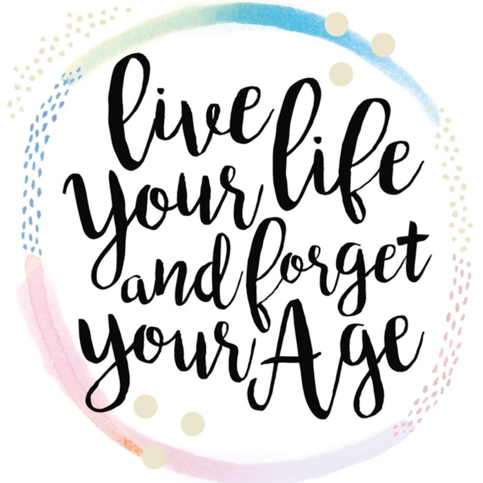 Feliciteer de jarige met deze vrolijk-gekleurde kaart. Op de kaart staat de tekst: "Live your life and forget your age." Vertaald: Leef je leven en vergeet je leeftijd.