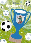 Illustratieve verjaardagskaart met voetbal, sterren, groene achtergrond en de tekst: 'Fijne verjaardag'. Verras de jarige met deze kleurrijke verjaardagskaart van Paperclip.