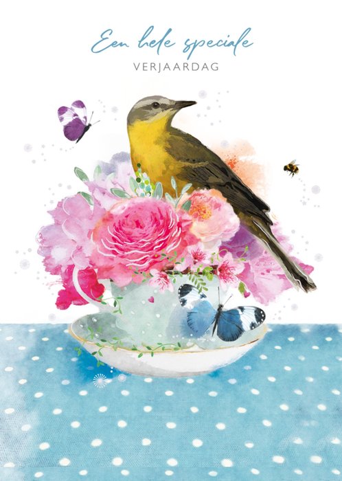 Prachtige verjaardagskaart met illustraties van een vogeltje, bloemen, vlinders en de tekst: 'Een hele speciale verjaardag'. Verras de jarige met deze mooie verjaardagskaart van Paperclip.