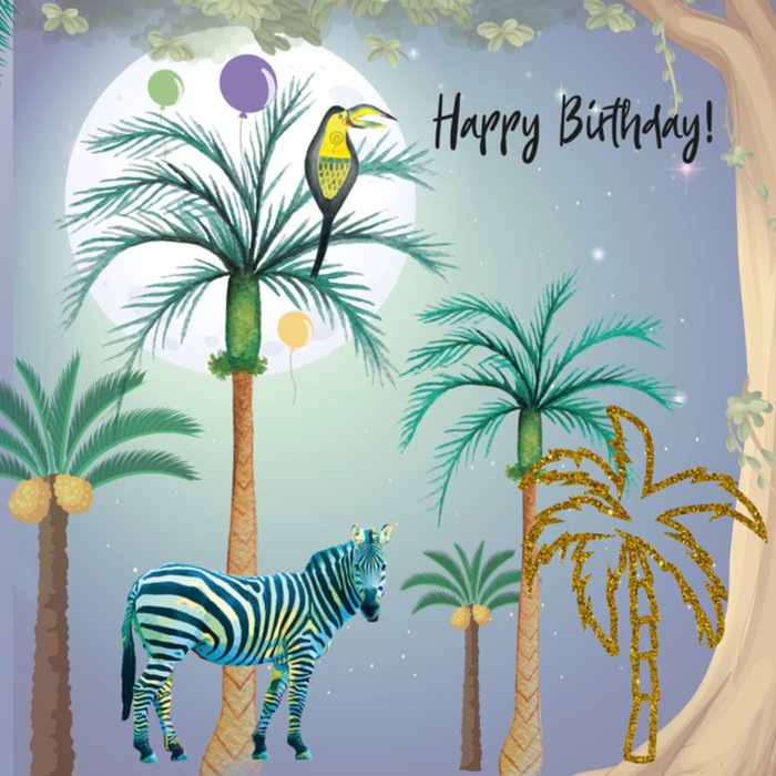Mooie verjaardagskaart van Paperclip om iemand een fijne verjaardag mee te wensen. Op de kaart zie je een zebra, palmbomen en de tekst: Happy birthday.