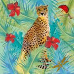 Kleurrijke zomaar kaart van Paperclip met op de kaart een luipaard, rode bloemen en mooie groene en blauwe bladeren.