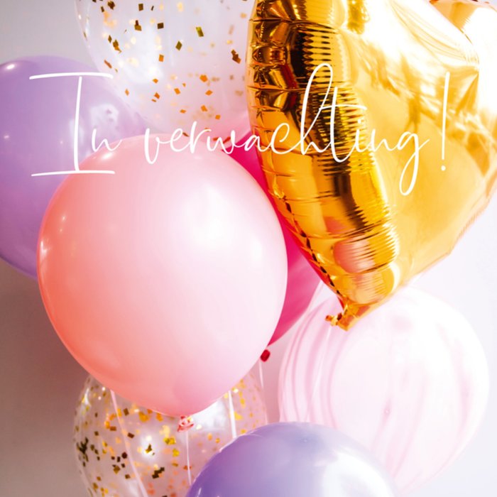 Hoera in verwachting! Feliciteer de zwangere met dit geluk. Op de kaart staan verschillende ballonnen afgebeeld met de tekst: in verwachting!