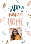 Kleurrijke nieuwe woning kaart met bladeren, aanpasbare foto en de tekst: 'Happy new home'. Verras iemand met deze leuke nieuwe woning kaart van Papercute.