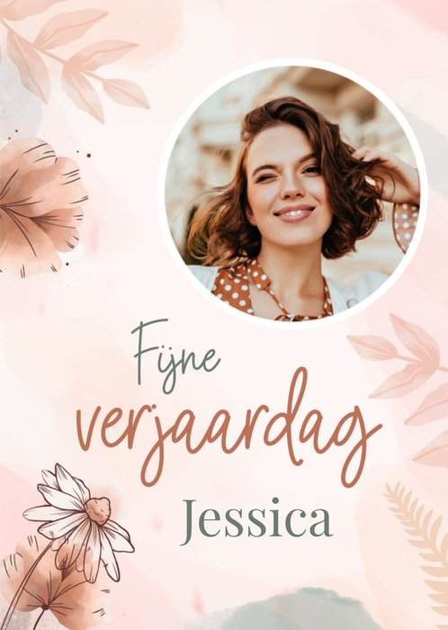 Roze verjaardagskaart met bloemen, aanpasbare foto en de tekst: 'Fijne verjaardag'. Verras iemand met deze stijlvolle verjaardagskaart van Papercute.