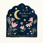Een prachtig ontworpen Eid Mubarak-kaart met een donkerblauwe boogvormige achtergrond, versierd met een gouden halve maan, sterren en delicate roze bloemen. De kaart straalt een warme en feestelijke sfeer uit, perfect om Eid met dierbaren te vieren. Gepersonaliseerd met de naam van de ontvanger voor een extra bijzondere touch.