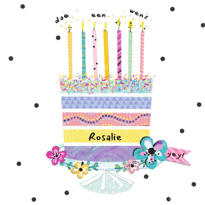 Vrolijke verjaardagskaart met een taart en aanpasbare naam.