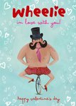 Kleurrijke valentijnskaart met een man op een eenwieler, witte harten en de tekst: 'Wheelie in love with you! Happy valentine's day'. Verras je liefde met deze illustratieve valentijnskaart van Fishuals.