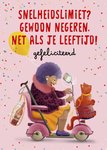Illustratieve verjaardagskaart met een vrouw, een katje, confetti en de tekst: 'Snelheidslimiet? Gewoon negeren, net als je leeftijd! Gefeliciteerd'. Verras iemand met deze grappige en kleurrijke verjaardagskaart van Fishuals.