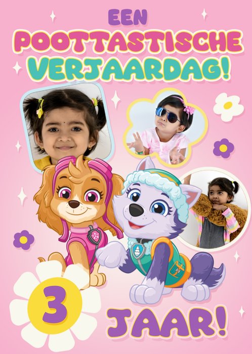 Met Skye en Everest van Paw Patrol met drie fotovakken in verschillende frames en schattige bloemetjes op een roze achtergrond.