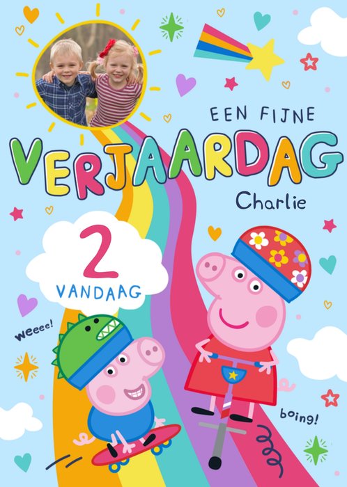 Verras iemand met deze vrolijke Peppa Pig verjaardagskaart. De leeftijd, naam en foto is aanpasbaar.