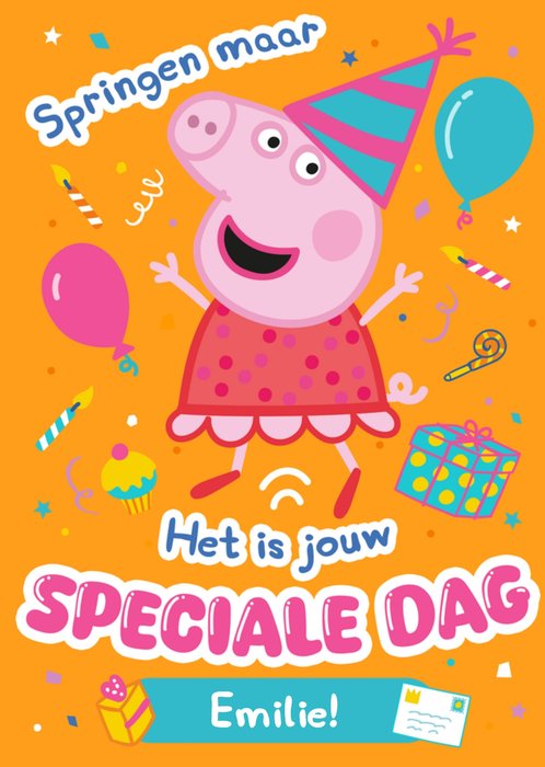 Dit Peppa Pig verjaardagskaartontwerp toont Peppa Pig die vrolijk springt in een feestmuts op een oranje achtergrond, omringd door feestelijke elementen zoals ballonnen, een cupcake, kaarsen, confetti en een cadeau. De Nederlandse tekst luidt "Springen maar" en "Het is jouw speciale dag", met de gepersonaliseerde naam "Emilie!" op een blauwe banner onderaan.