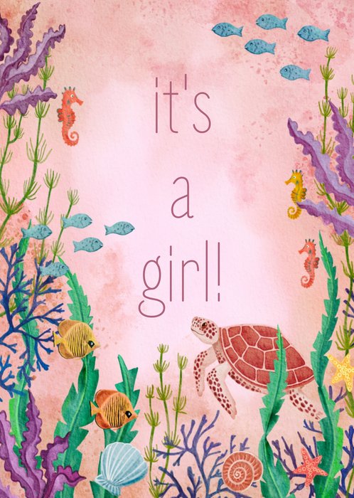 Vrolijke geboortekaart met zee thema en aanpasbare tekst.