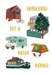 Leuke nieuwe woning kaart met de tekst: Gefeliciteerd met je nieuwe woning! Op de kaart staan illustraties van een camper, tent, woonboot en huizen.