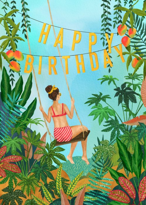 Wat een hippe kaart van Petit Konijn. Deze kaart kun je sturen voor een verjaardag. Op de kaart zie je een vrouw op een schommel en daarboven de tekst: Happy birthday.