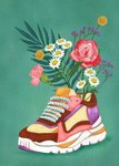 Leuke zomaarkaart met illustratie van een schoen met een bosje bloemen.