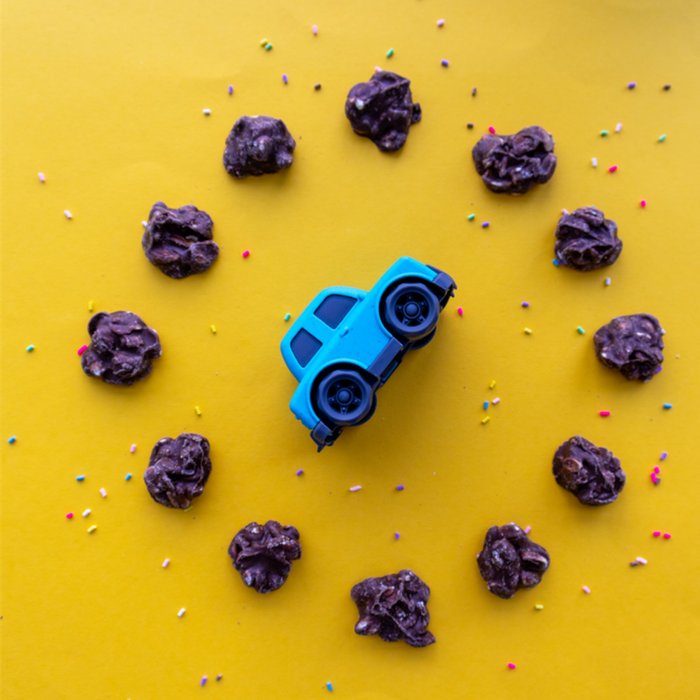 Kleurrijke rijbewijs geslaagdkaart met snoepjes, blauwe auto en gele achtergrond. Verras iemand met deze leuke geslaagdkaart van Photoflash.