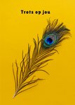 Kleurrijke geslaagdkaart met een pauwenveer, gele achtergrond en de tekst: 'Trots op jou'. Verras iemand met deze leuke geslaagdkaart van Photoflash.