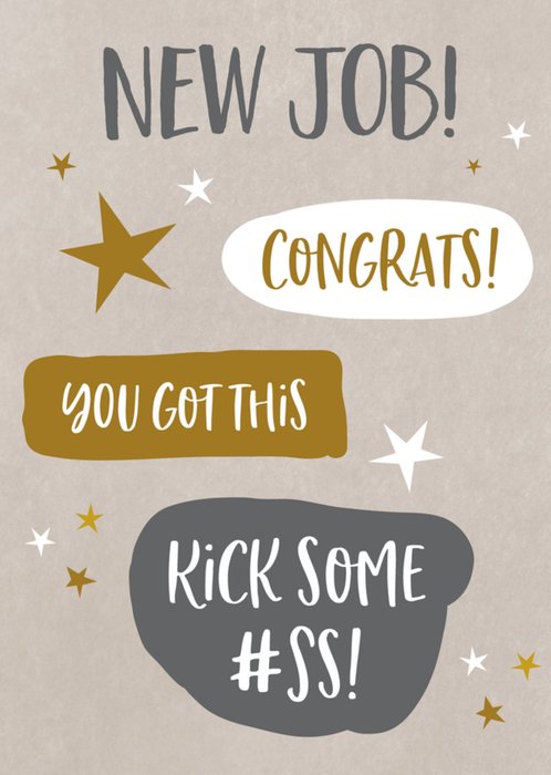 Kleurrijke nieuwe baan kaart met een winkelwagentje, gele achtergrond en de tekst: 'Gefeliciteerd met je nieuwe baan'. Verras iemand met deze leuke nieuwe baan kaart van Photoflash.