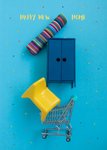 Kleurrijke nieuwe woning kaart met meubels, blauwe achtergrond en de tekst: 'Happy New Home'. Verras iemand met deze leuke nieuwe woning kaart van Photoflash.