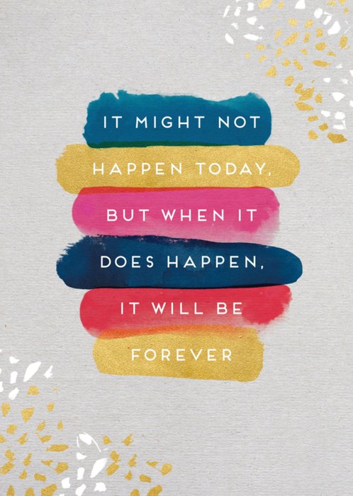 Kleurrijke wenskaart met de tekst: It might not happen today. But when it does happen, it will be forever.