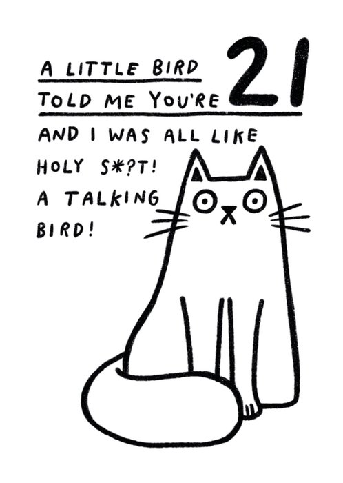 Grappige verjaardagskaart met kat en de tekst: A little bird told me you're 21 and i was like holy s*?t! a talking bird!