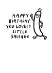 Grappige verjaardagskaart met de tekst: Happy birthday you lovely little sausage.
