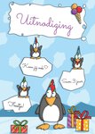 Grappige uitnodiging voor een kinderfeestje van TMS, met pinguïns op de voorkant. In het kader kan een eigen leeftijd worden toegevoegd.