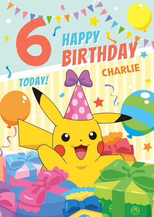 Kleurrijke verjaardagskaart met pikachu, ballonnen, cadeautjes en de tekst: 'Happy birthday'. Verras iemand met deze leuke verjaardagskaart van Pokémon.