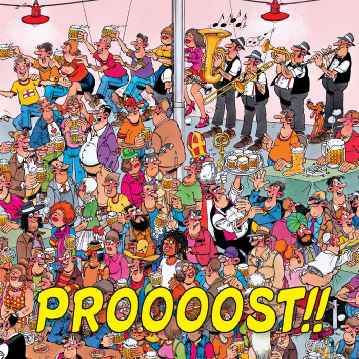 Op deze kaart is een drukke feestlocatie afgebeeld met daarvoor de tekst proost!