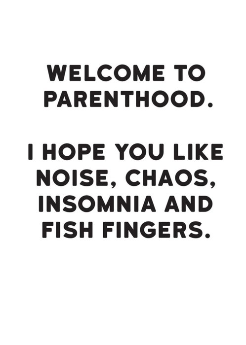 Grappige geboortekaart met de tekst: Welcome to parenthood. I hope you like noise, chaos, insomnia and fish fingers.