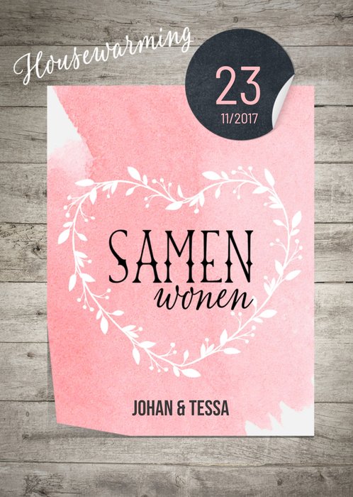 Een lieve housewarming uitnodiging van Luckz! Op de achtergrond van de kaart zie je een houten muur. Op deze houten muur is poster geplakt met de tekst: Samenwonen. Je kunt jullie naam ook op de poster zetten en de datum van jullie housewarming.