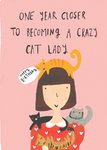 Grappige verjaardagskaart met illustratie en de tekst: One year closer to becoming a crazy cat lady