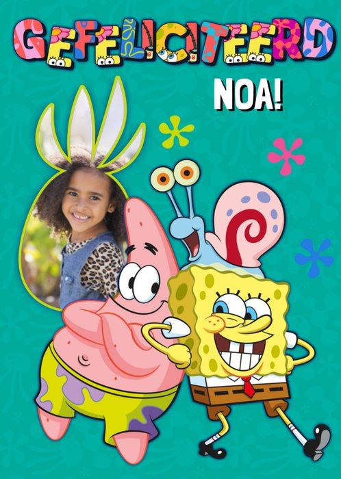 Kleurrijke verjaardagskaart met SpongeBob, Patrick, aanpasbare foto en de tekst: 'Gefeliciteerd'. Verras iemand met deze leuke verjaardagskaart van SpongeBob Squarepants.