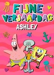 Kleurrijke verjaardagskaart met SpongeBob, Patrick, Squidward, roze achtergrond en de tekst: 'Fijne Verjaardag'. Verras iemand met deze leuke verjaardagskaart van SpongeBob Squarepants.