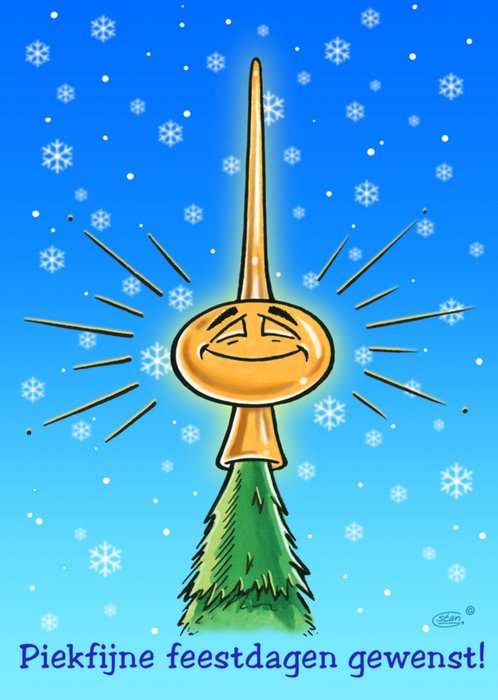 Leuke kerstkaart met een kerstboom piek en de tekst: 'Piekfijne feestdagen gewenst!'. Verras iemand deze kerst met deze illustratieve kaart van Studio xmas en Stan Groenland.