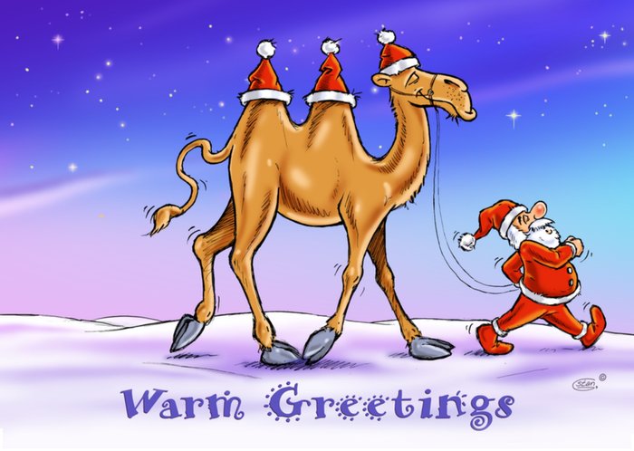 Leuke kerstkaart met een kameel, de Kerstman en de tekst: 'Warm Greetings'. Verras iemand deze kerst met deze illustratieve kaart van Studio xmas en Stan Groenland.