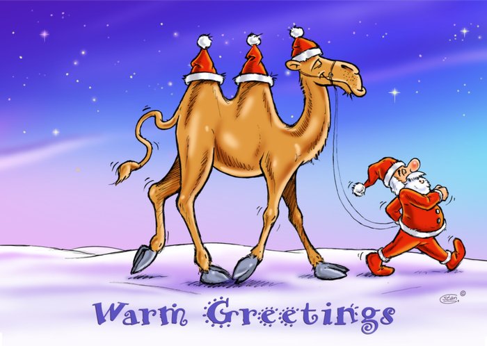Leuke kerstkaart met een kameel, de Kerstman en de tekst: 'Warm Greetings'. Verras iemand deze kerst met deze illustratieve kaart van Studio xmas en Stan Groenland.