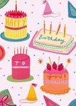 Smakelijke verjaardagskaart met illustratie van meedere taarten.