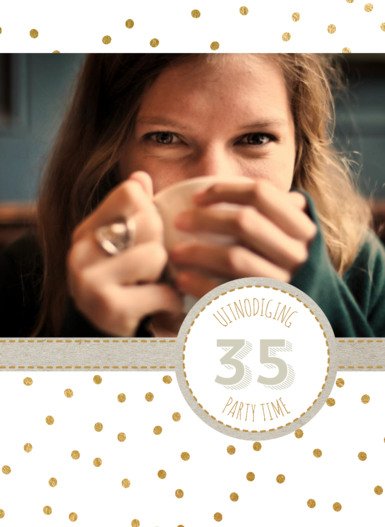 Trendy en witte uitnodiging van Greetz met een eigen foto en leeftijd. De uitnodiging heeft een hip stippenpatroon.